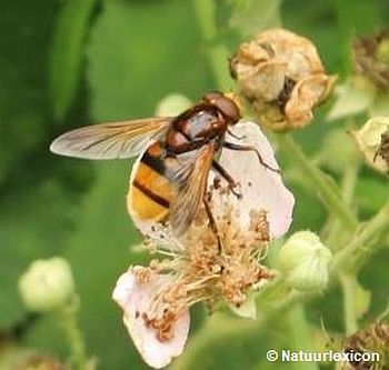 Deze zweefvlieg lijkt door het gele achterlijf met zwarte dwarsbanden in combinatie met een rood borststuk op een Hoornaar